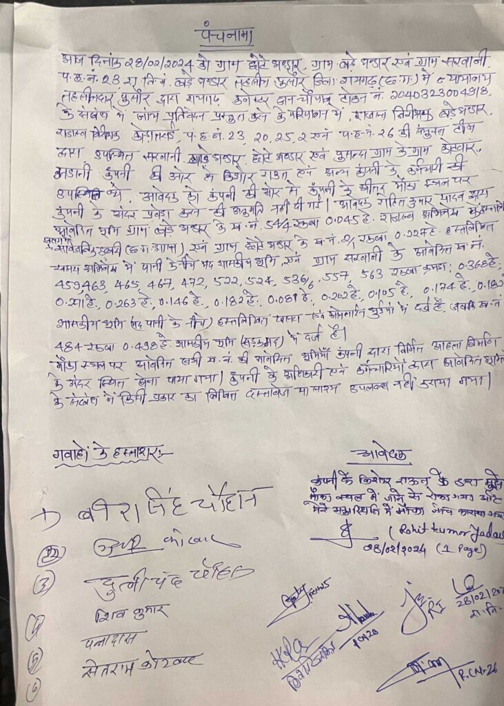 रायगढ़। ग्राम बड़े भंडार, तहसील पुसौर में अडानी पावर लिमिटेड पर सरकारी भूमि पर अवैध कब्ज़ा करने का गंभीर आरोप लगा है। ग्रामीणों ने कलेक्टर रायगढ़ को ज्ञापन सौंपकर तत्काल कार्रवाई की मांग की है।