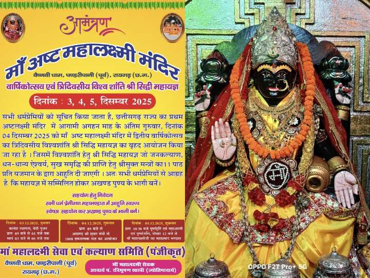 रायगढ़ । माँ अष्टमहालक्ष्मी मंदिर वैष्णवी धाम,पंडरीपानी (तटपूर्व) रायगढ़ में द्वितीय वार्षिकोत्सव के अवसर पर त्रिदिवसीय विश्व शांति श्री सिद्धि महायज्ञ जनकल्याण,धन,ऐश्वर्य,सुख,समृद्धि की प्राप्ति हेतु भव्य महायज्ञ का आयोजन अगहन माह के अंतिम गुरुवार दिनांक 3,4 एवं 5 दिसंबर 2025 को किया जा रहा है ज्योतिषाचार्य मां महालक्ष्मी सेवक आचार्य पंडित रवि भूषण शास्त्री ने समस्त श्रद्धालु जनों को वार्षिकोत्सव एवं महायज्ञ में पूण्य के भागी बनने के लिये अधिक से अधिक संख्या में शामिल होने अपील किया है।